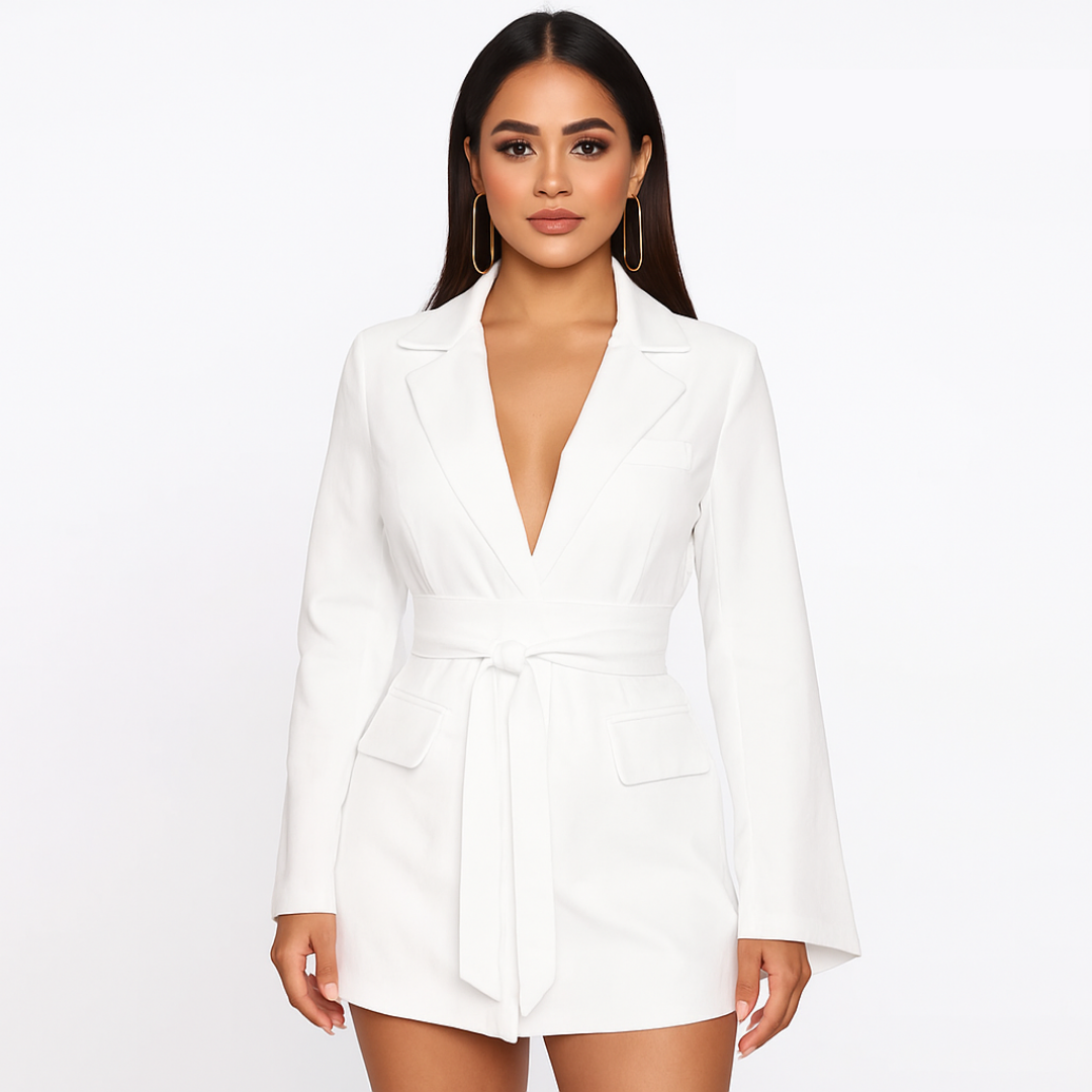 Este blazer é a peça-chave que faltava no seu guarda-roupa. Com corte sofisticado, cinto ajustável e abotoamento frontal em estilo clássico, ele valoriza a silhueta feminina enquanto transmite autoridade e estilo.