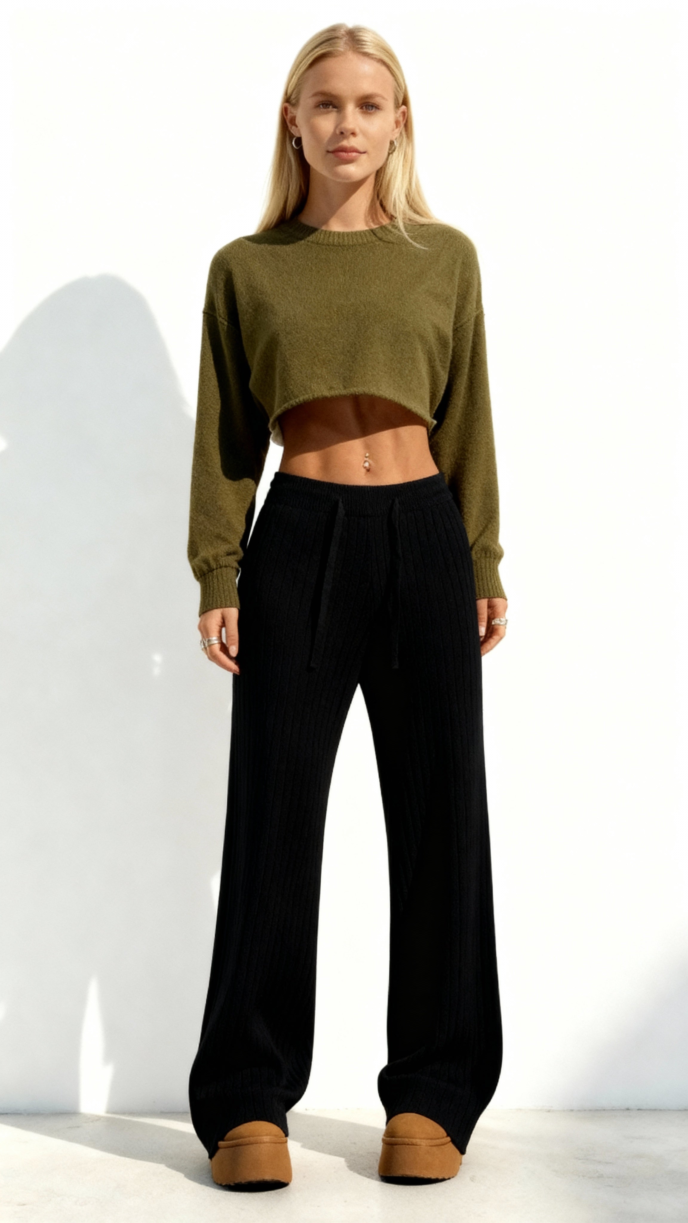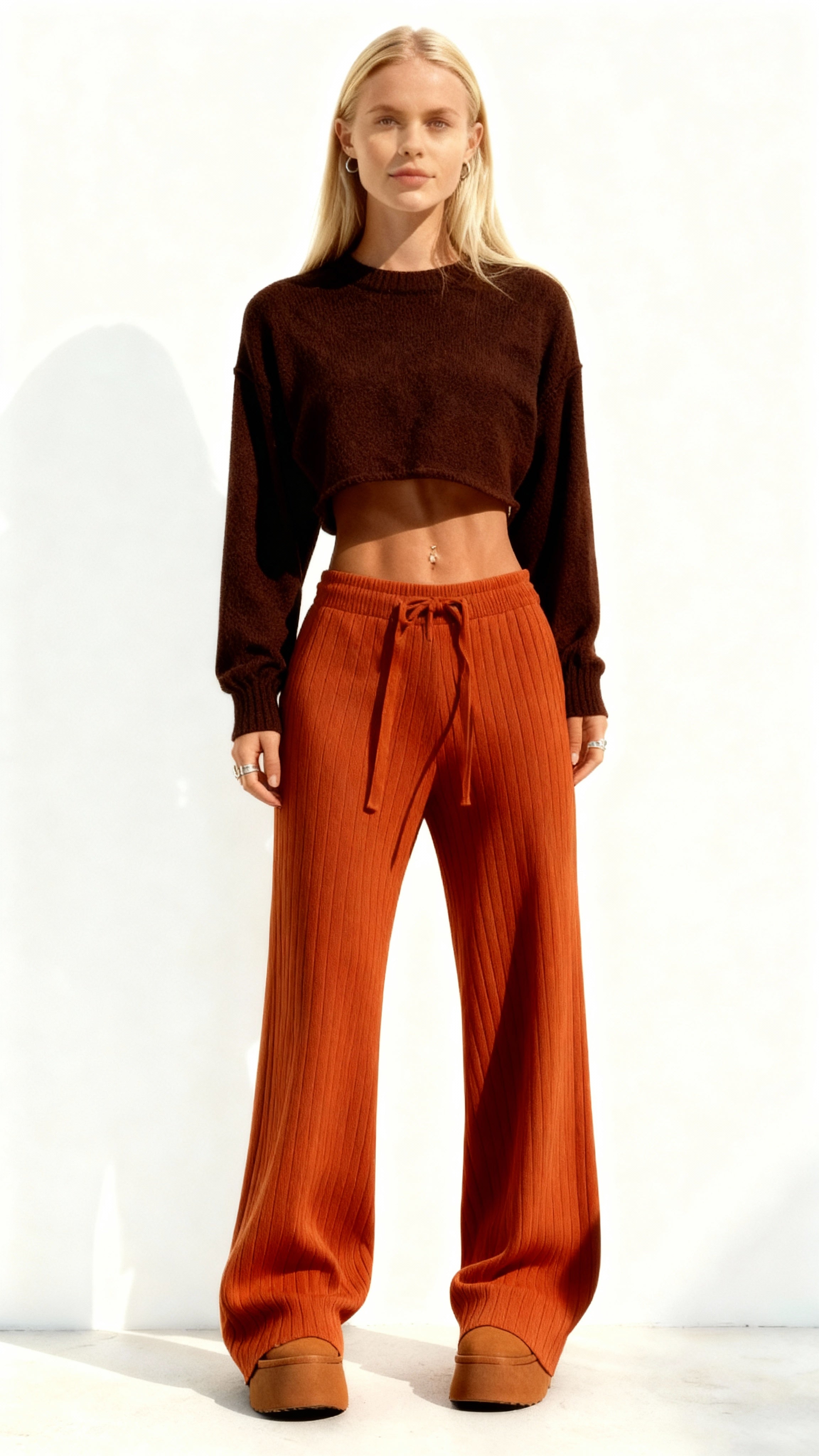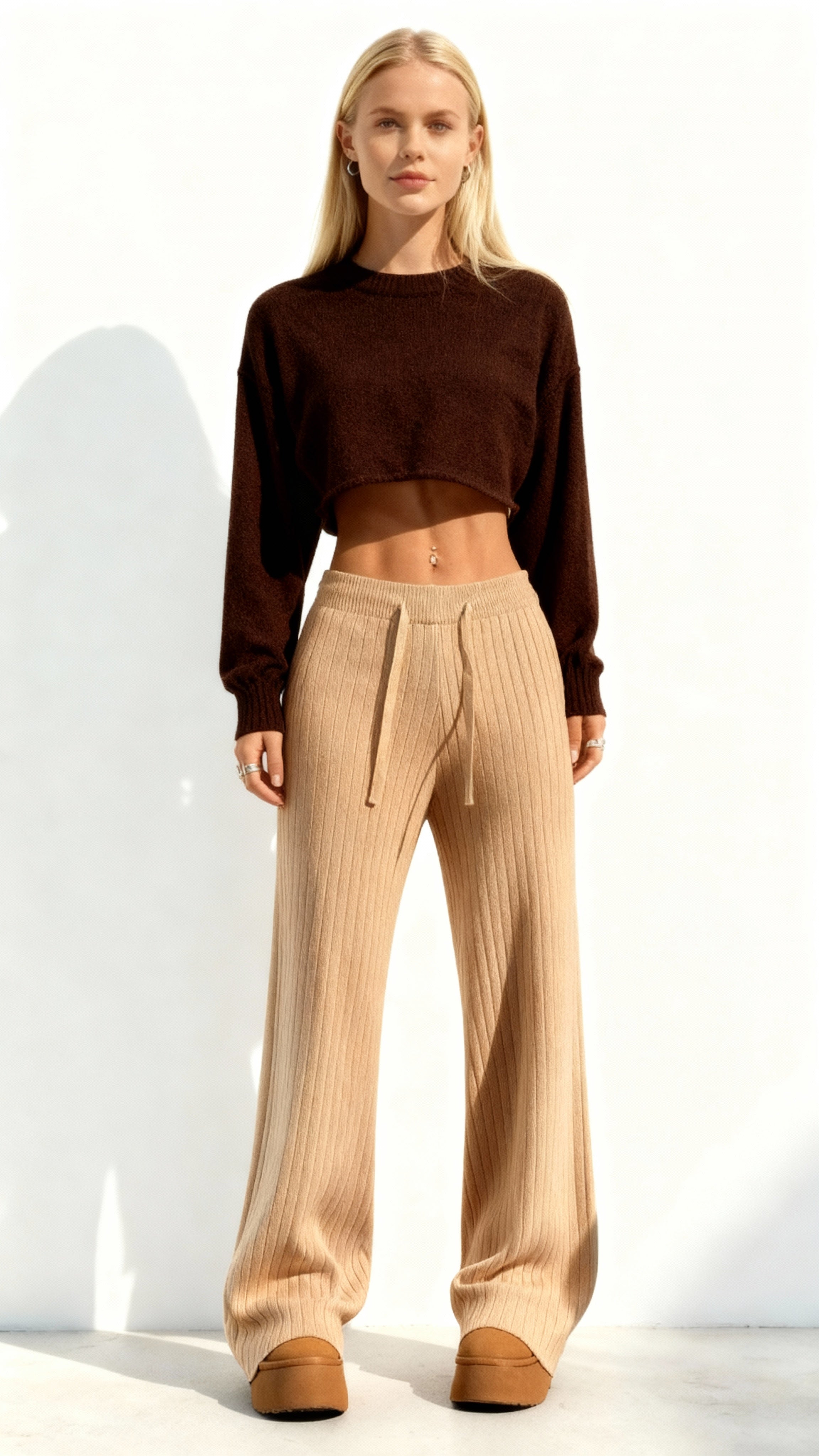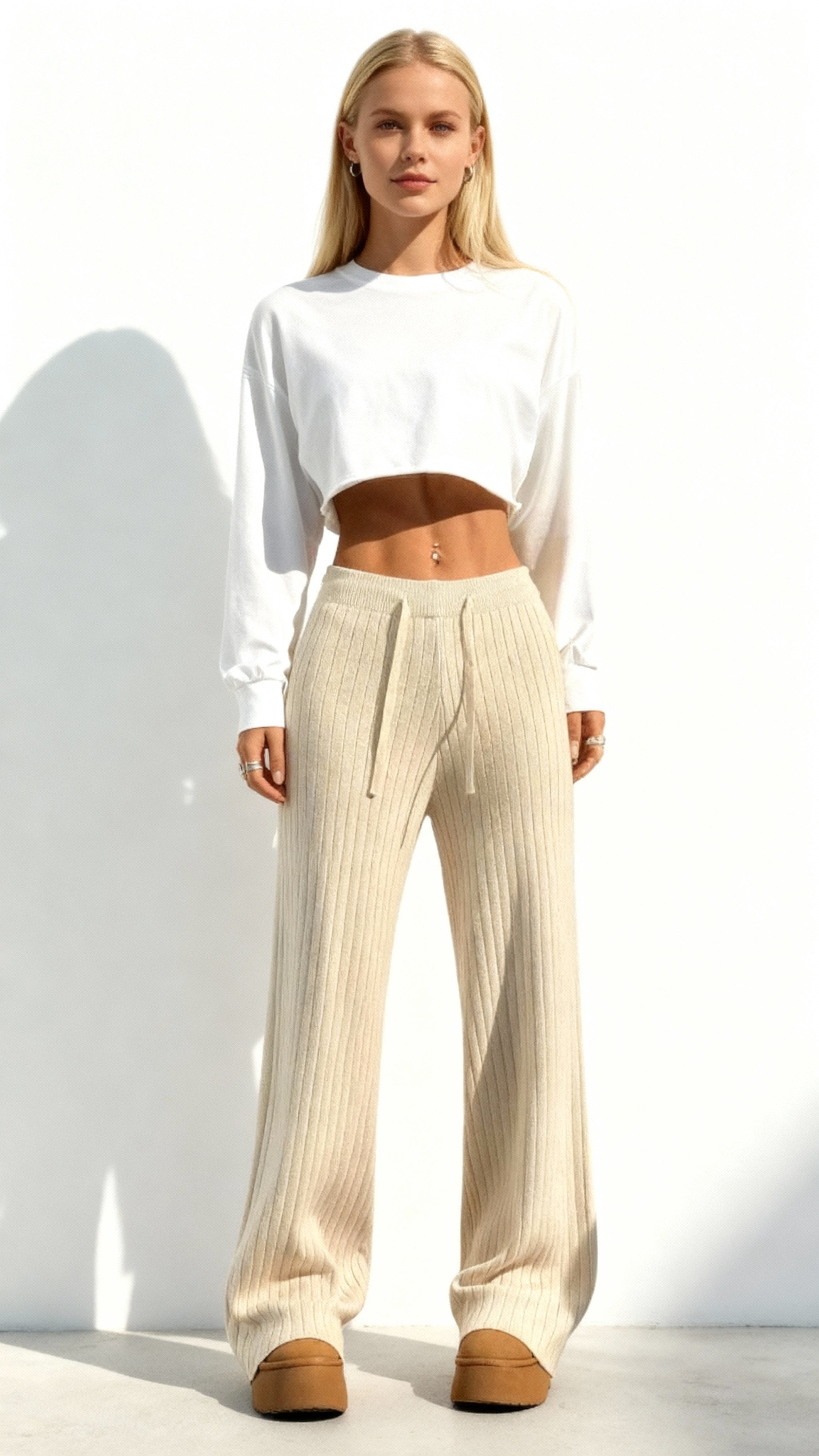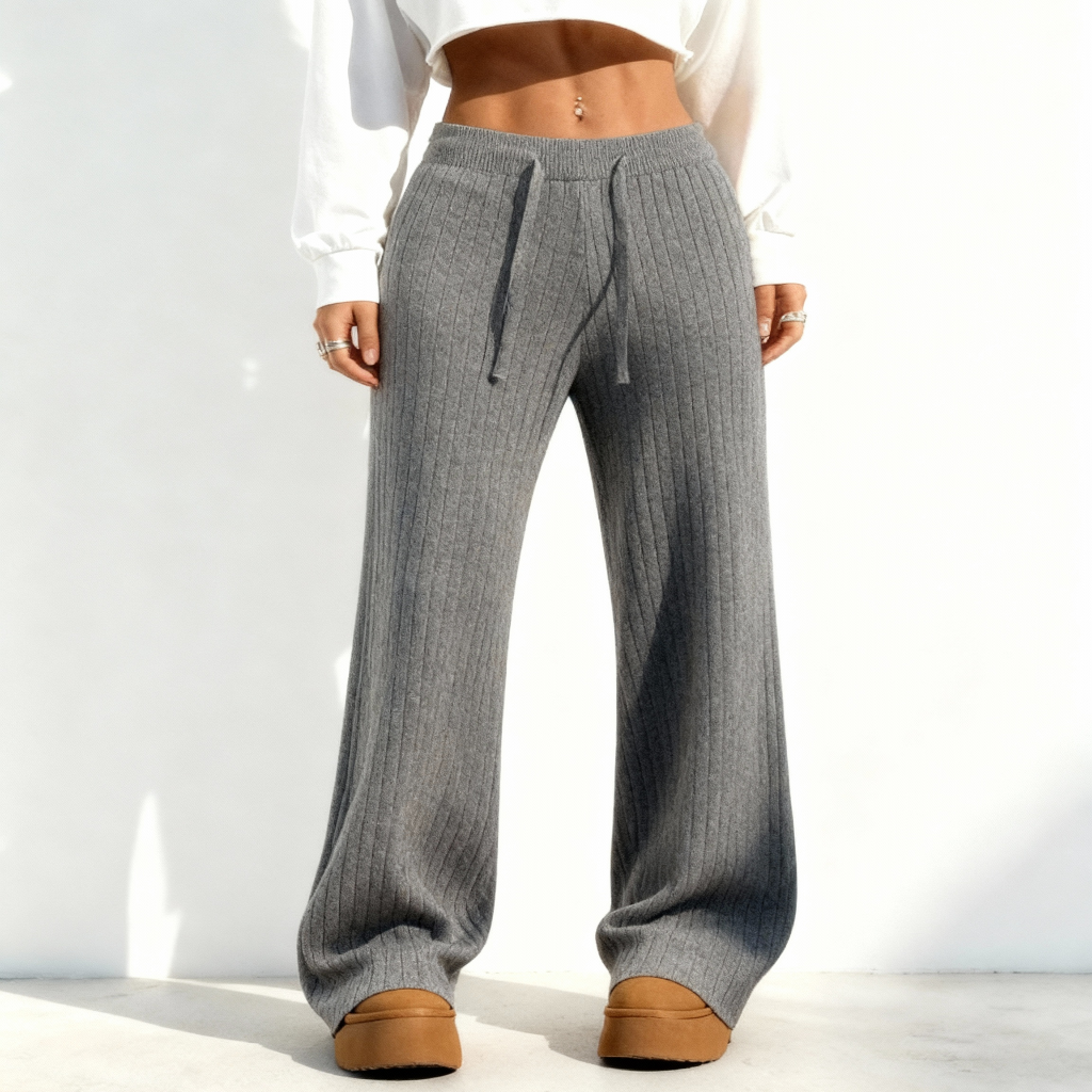 Aproveite o conforto e o estilo com as calças femininas de malha de cintura alta e pernas largas. Feitas com...
