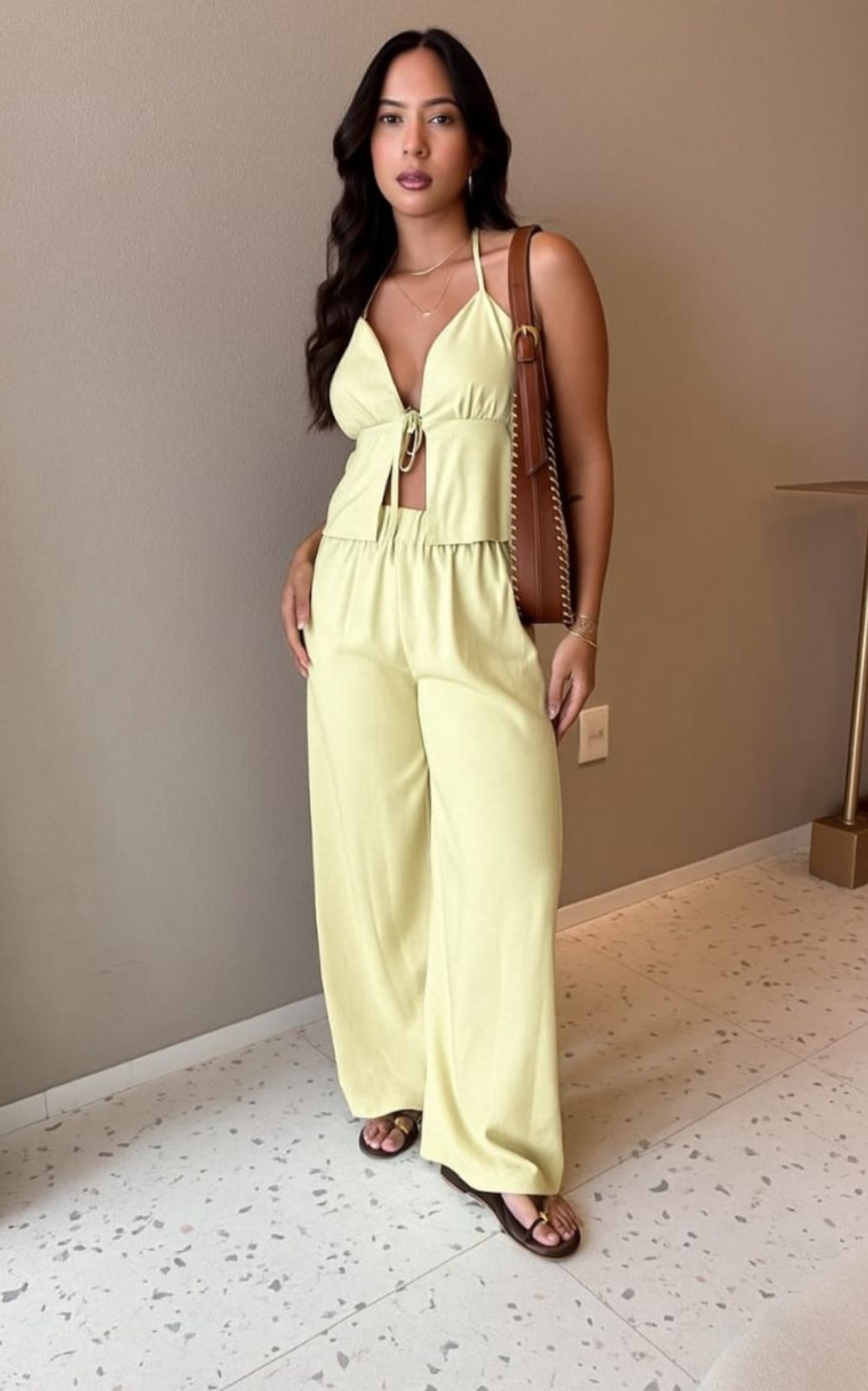 Chiquease Terno de Calça Pantalona Larga Solta com Pescoço Halter Pregueado em Tecido 261