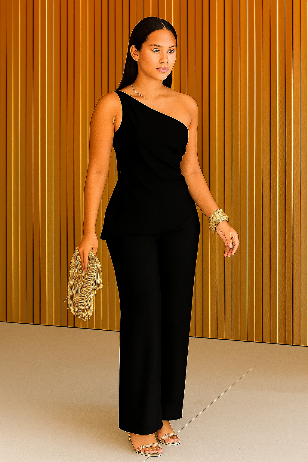Eleva sua elegância com o Conjunto de 2 peças de calças. Com gola inclinada e um ombro só, é uma...