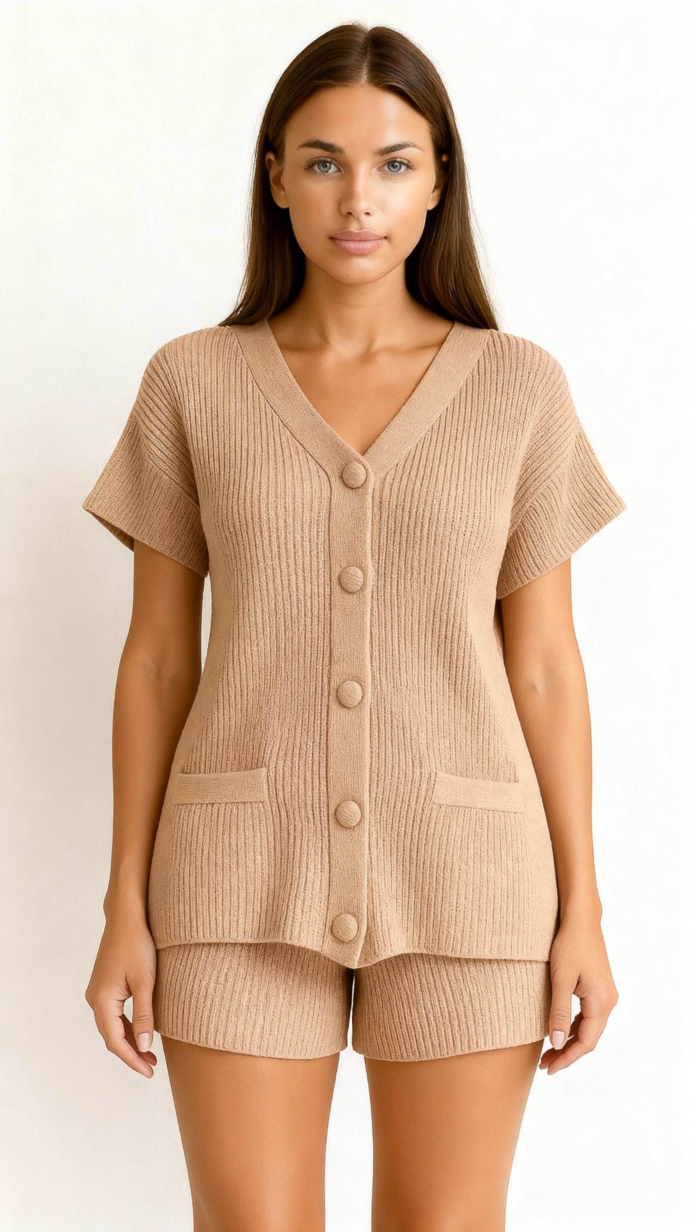 Conjunto de shorts feminino casual de 2 peças com botões e decote em V 24