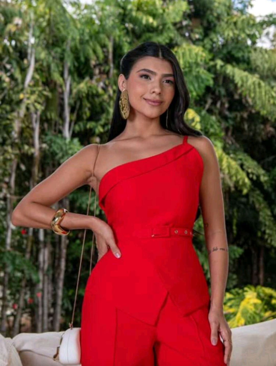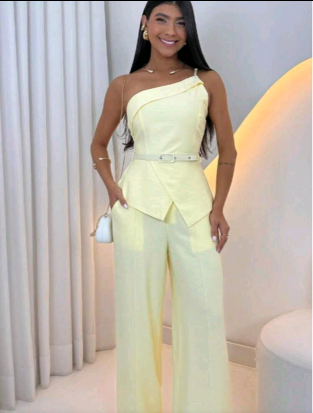 Eleve o seu estilo com o Conjunto Feminino Blusa 1 ombro Assimetrica e calça Pantalona Com cinto. A blusa de ombro único e a calça elegante com cinto são perfeitas para uma mulher moderna e sofisticada. Seja notada pela sua personalidade e elegância com este conjunto.