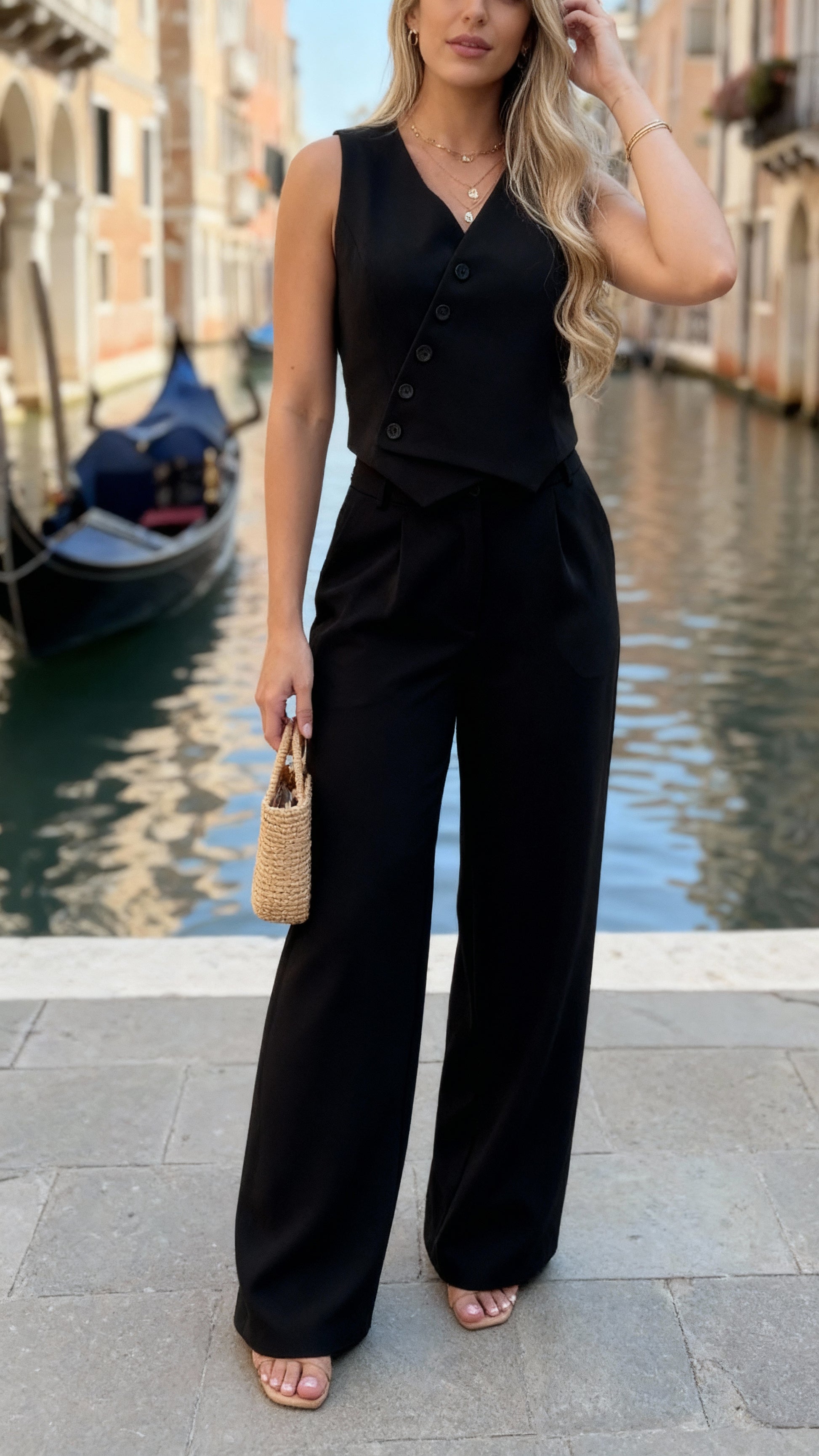 Eleve o seu estilo com este conjunto sofisticado e moderno, composto por um colete de gola halter com fechamento único e uma calça longa de corte elegante. Ideal para ocasiões que pedem um toque de ousadia com classe — seja um jantar especial, um evento social ou um look de trabalho com personalidade.