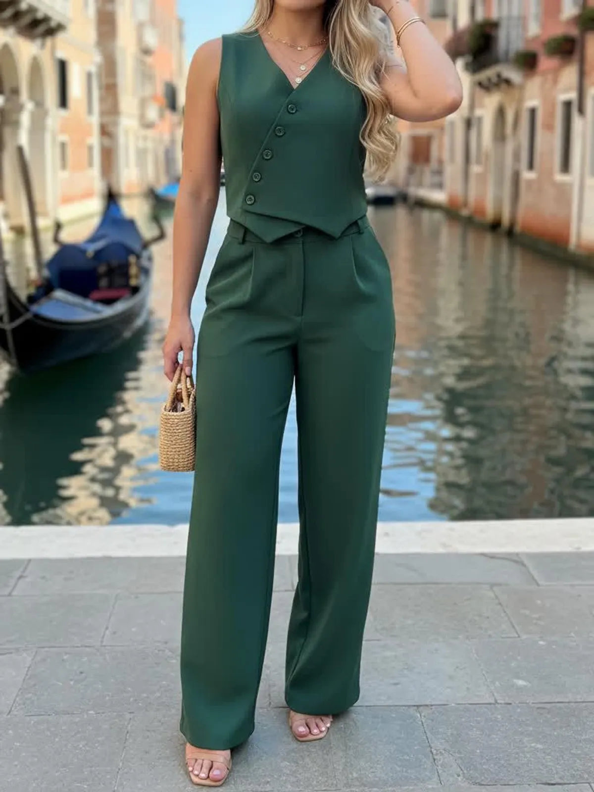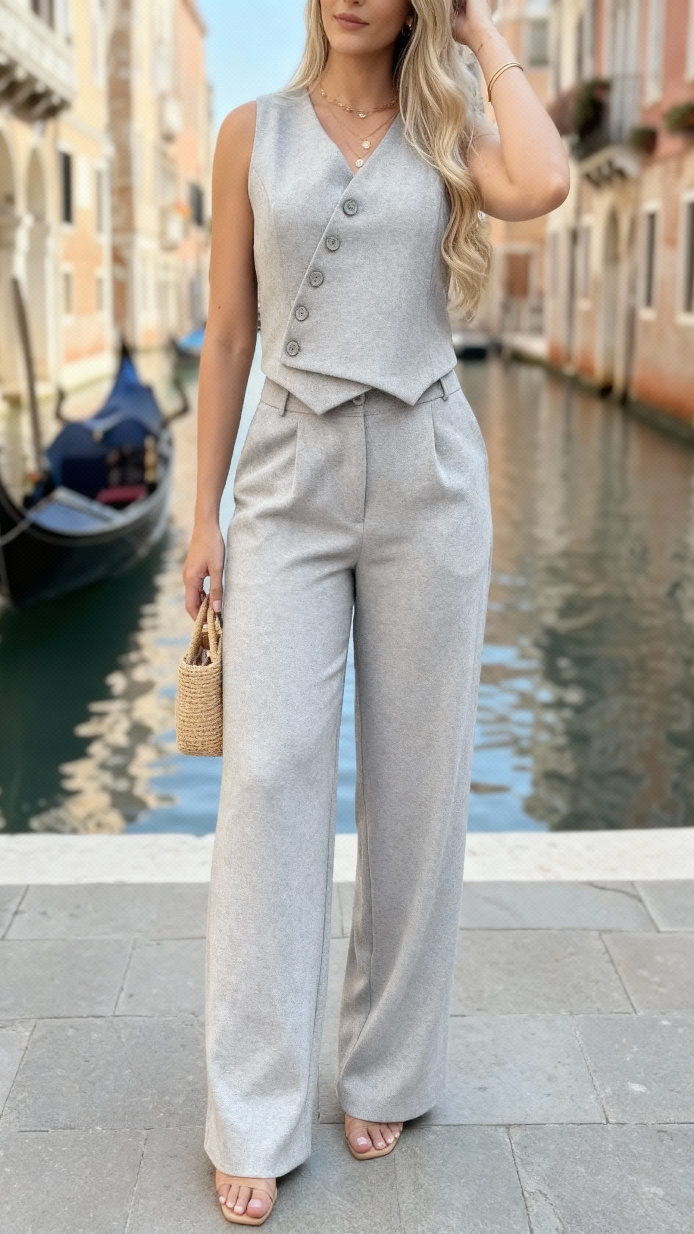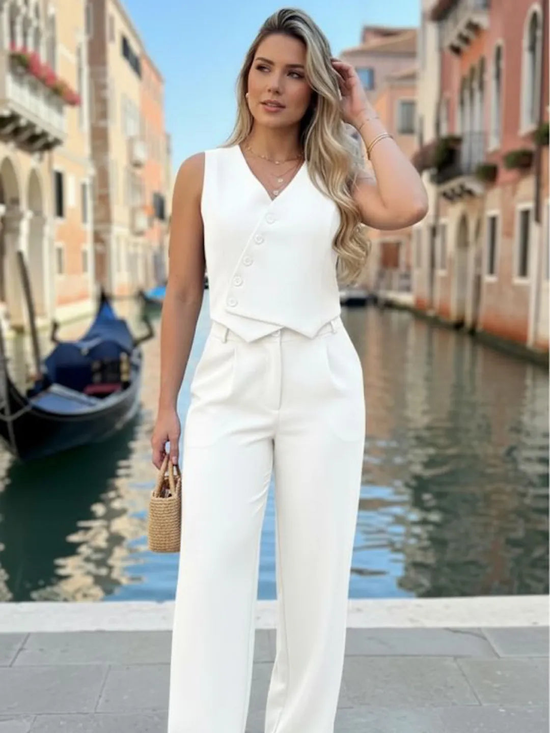 Assimétrico Conjunto Feminino de Duas Peças: Colete com Gola Halter e Calça Longa 57