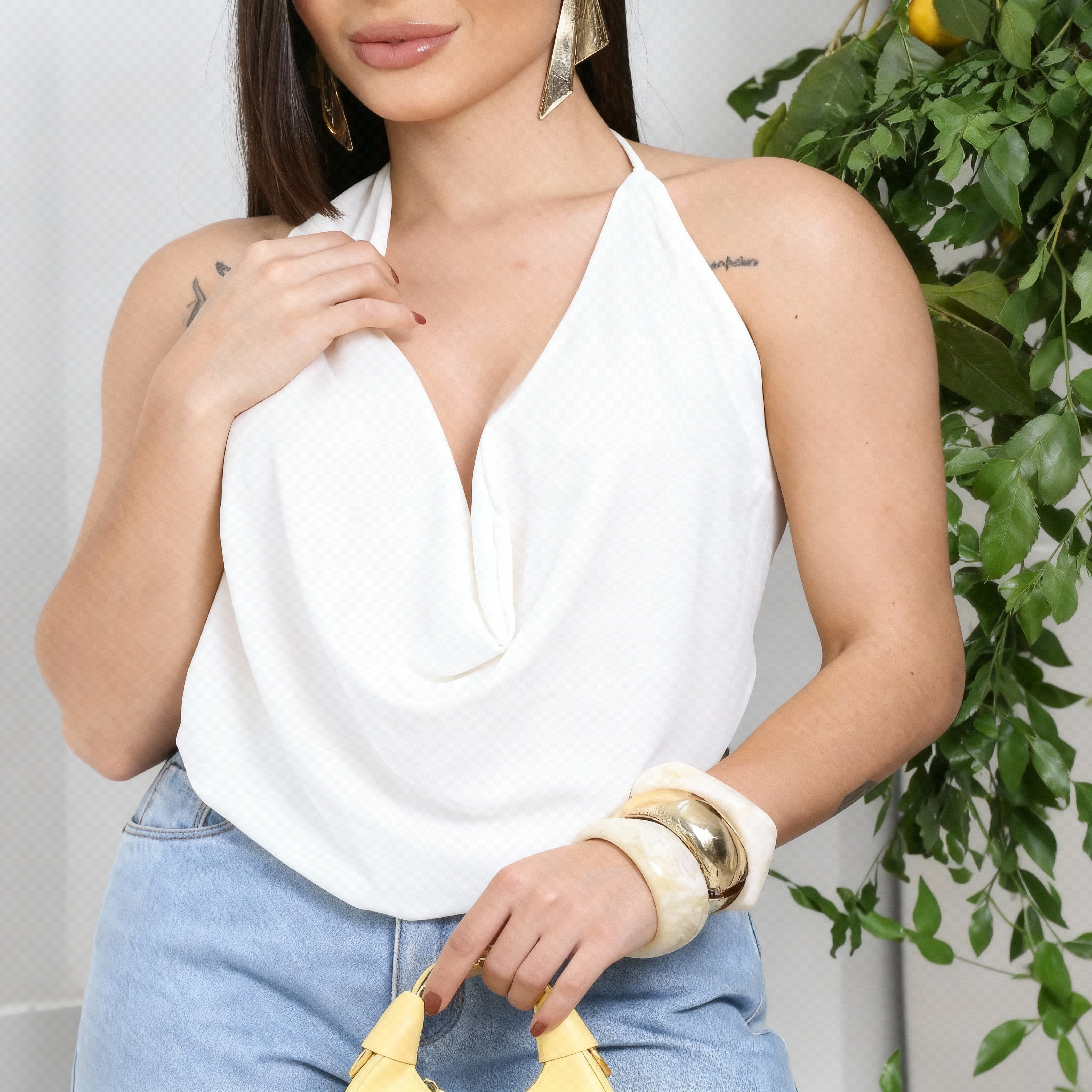Aproveite uma aparência elegante e moderna com a nossa Cropped Blusa Top. Com seu design único de decote frontal e...
