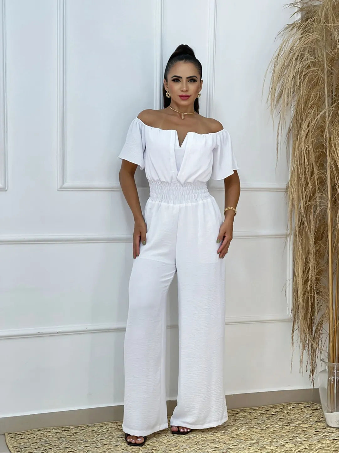 Macacão longo feminino verde com ombros descobertos e manga curta, com babados e detalhes franzidos 254