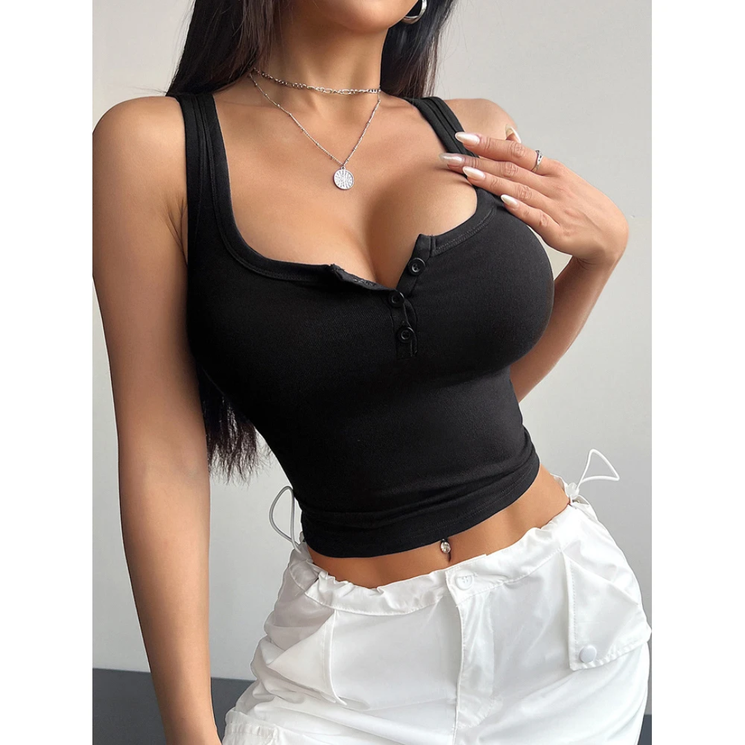 Regata Feminina de Verão na Cor Sólida com Botões e Decote Meio Placket 160