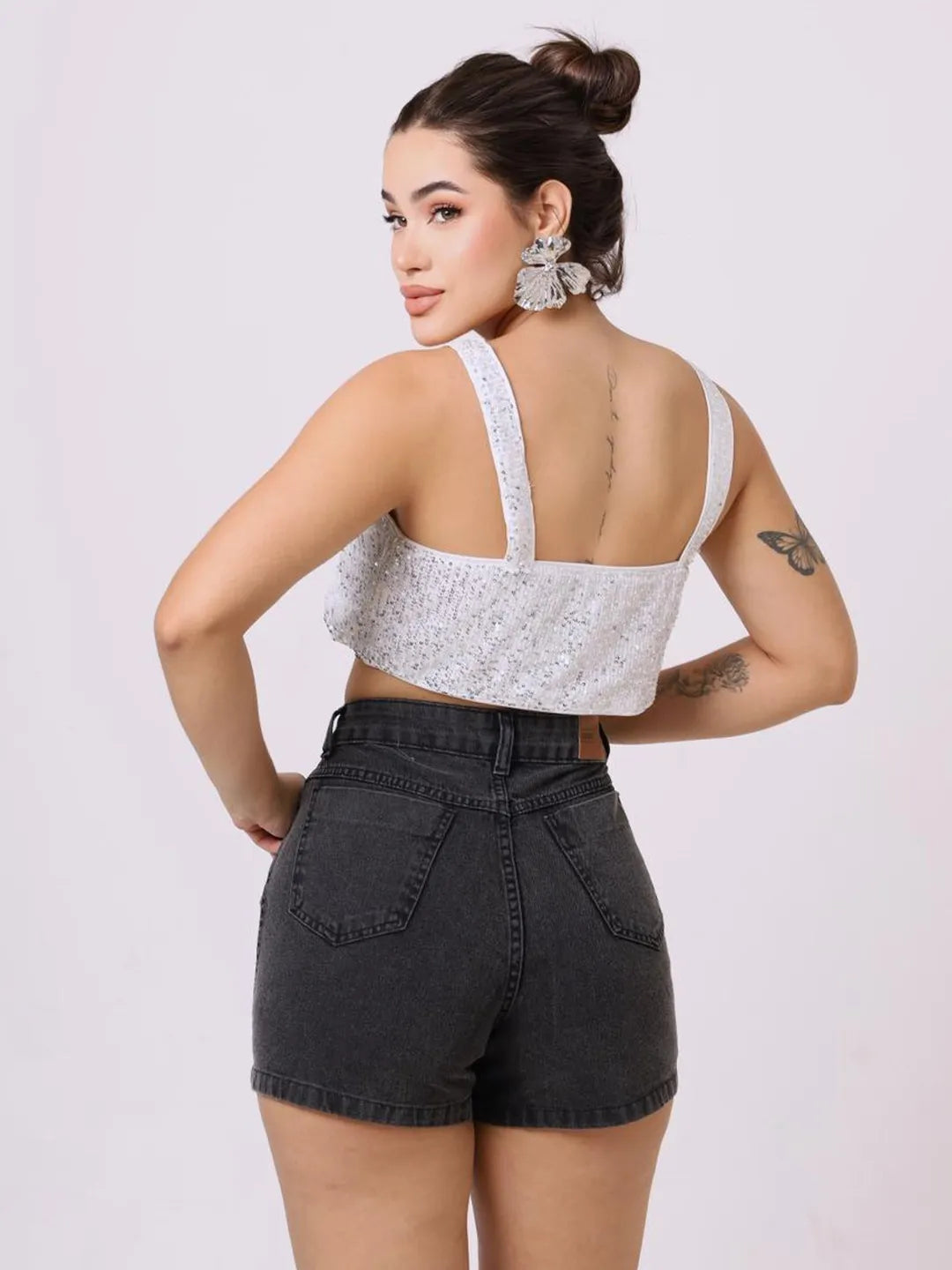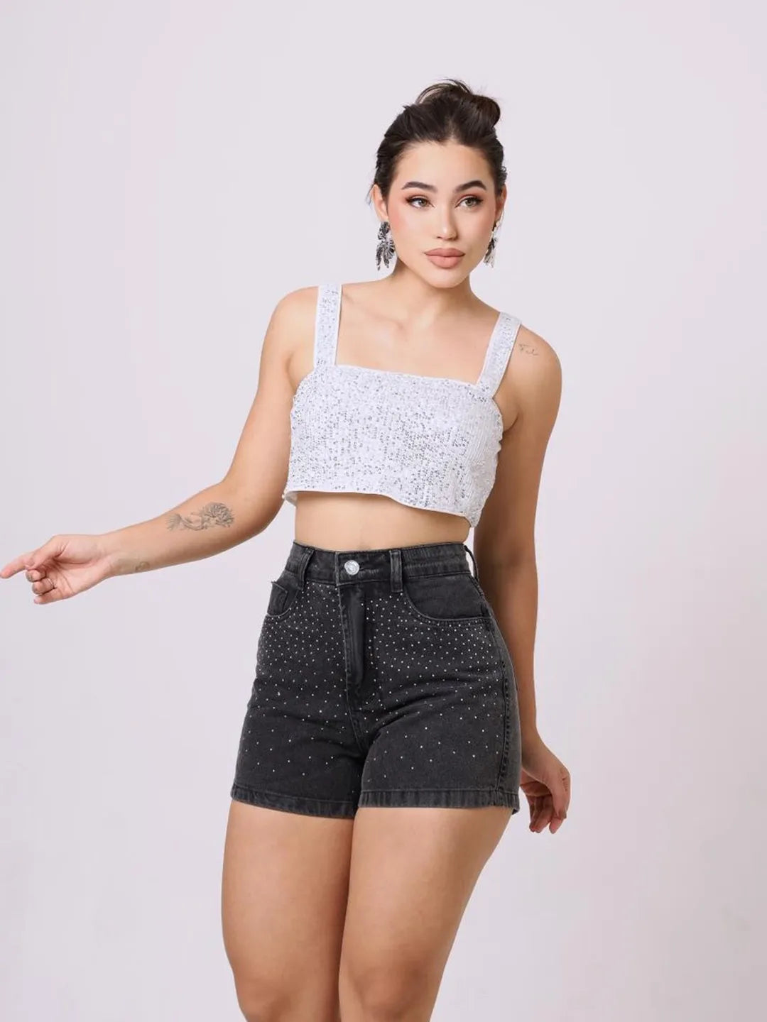 Revela o seu lado brilhante com o nosso Short jeans aplicação strass! Com um charmoso bolso na frente, este short...