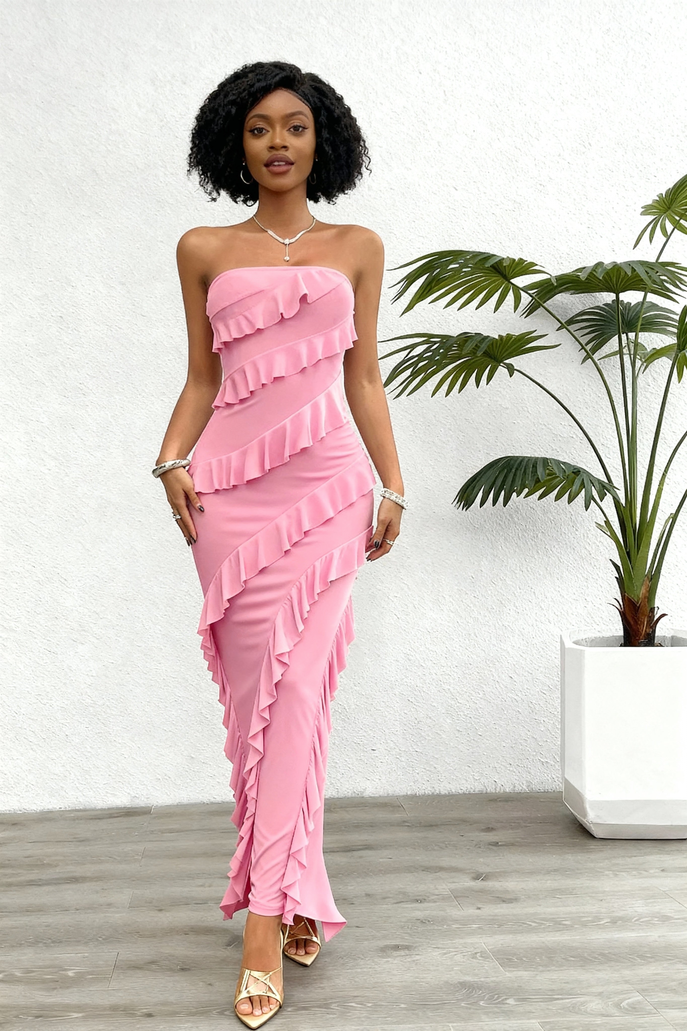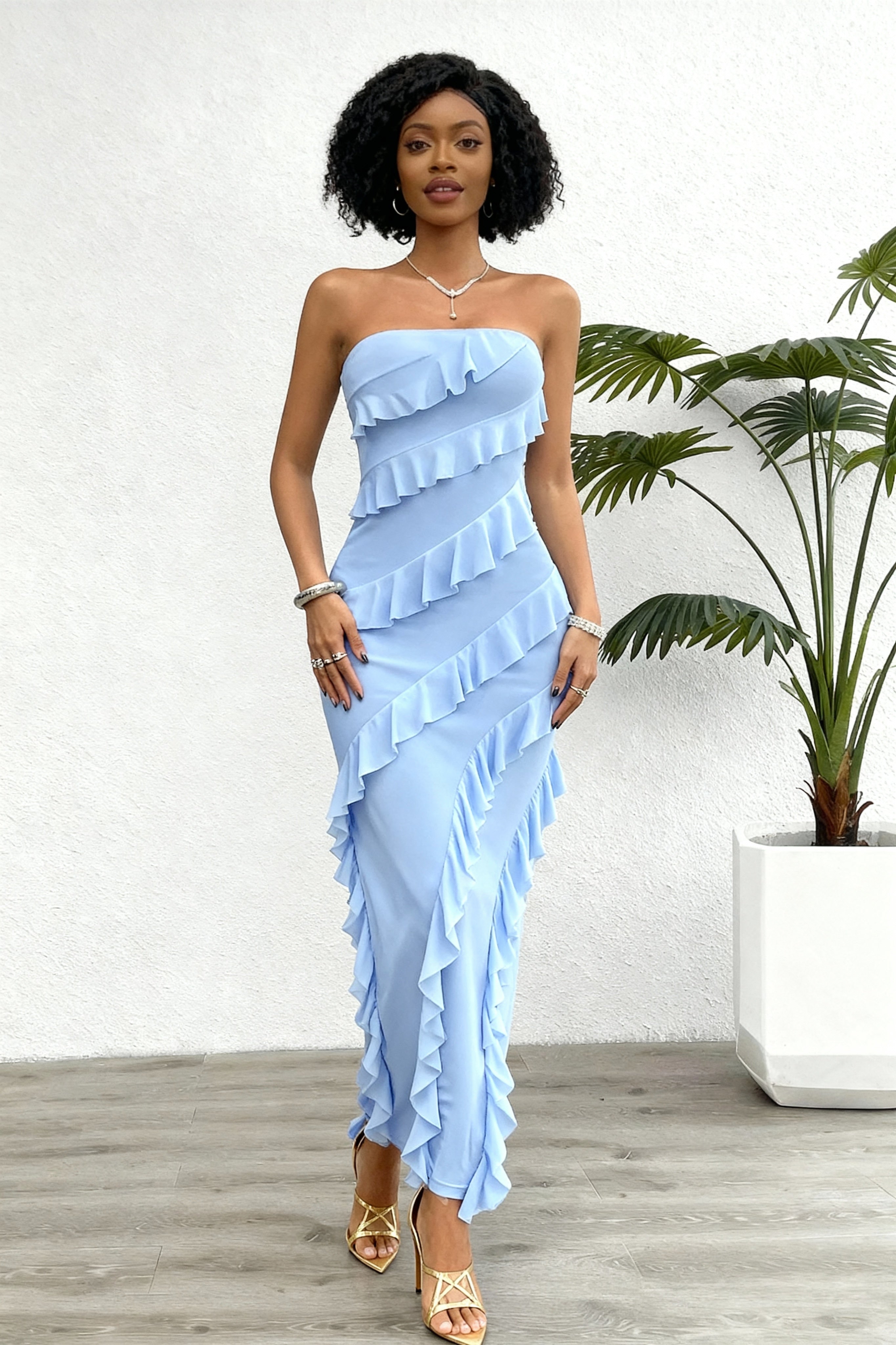 Vestido Longo com Bainha sem alças, Múltiplas Camadas, Estilo Folha de Lótus com Babados 147