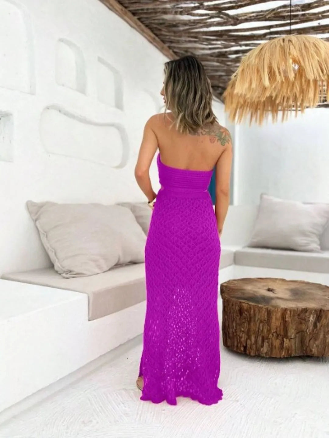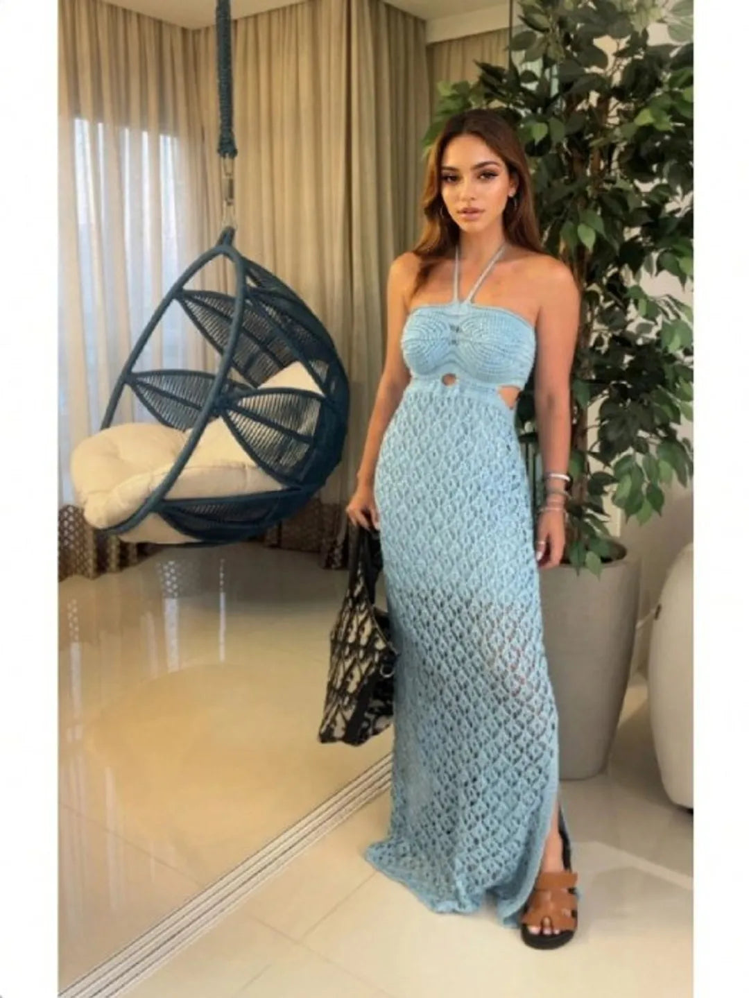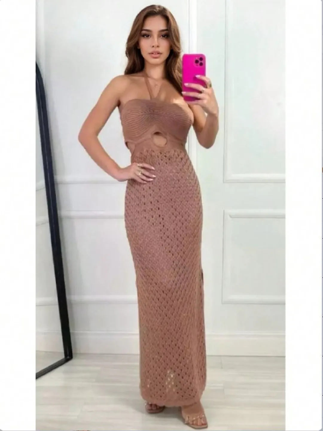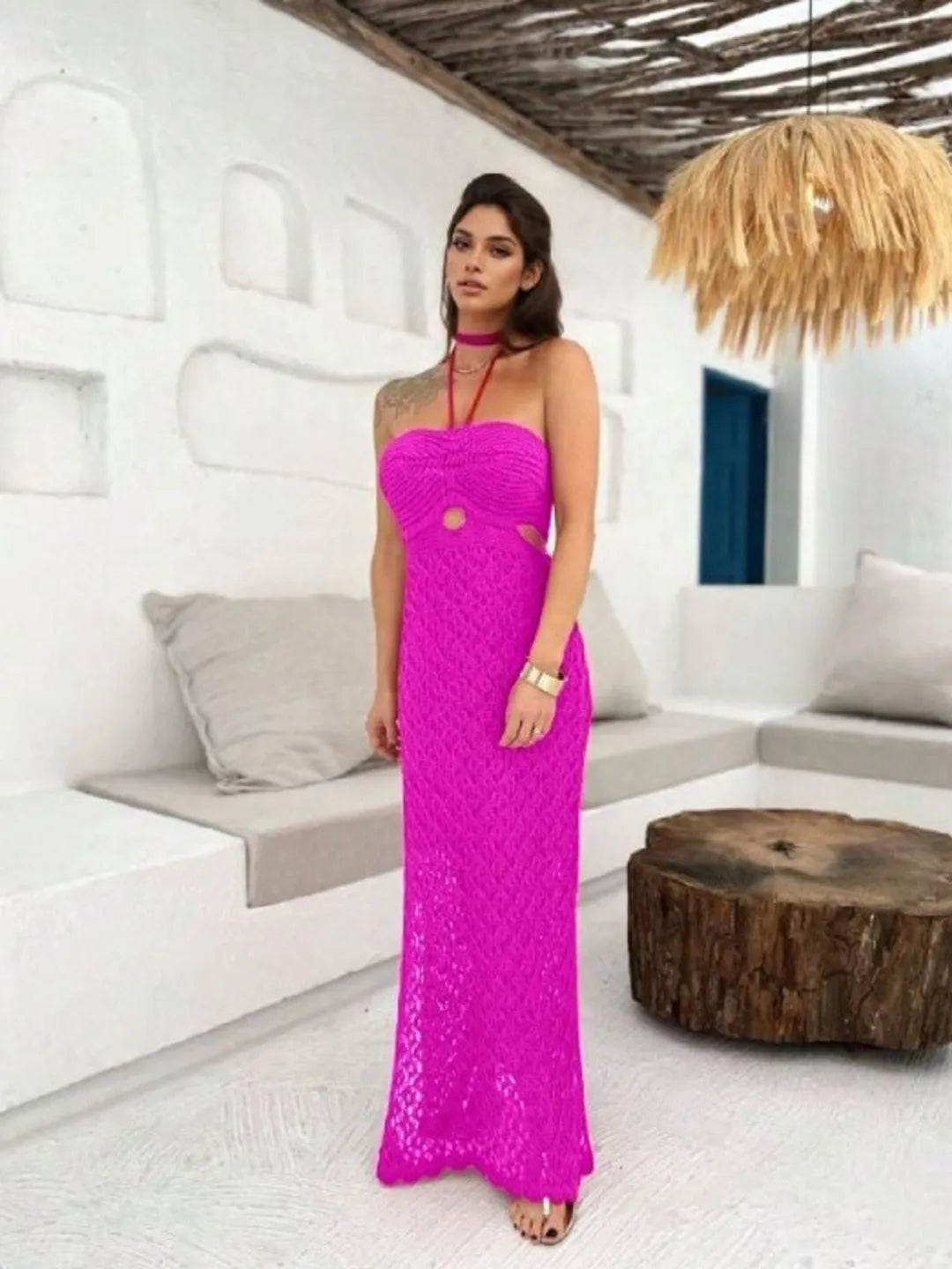 Este vestido longo em tricot rendado é uma escolha elegante e sofisticada para qualquer ocasião. Com alças delicadas e um...