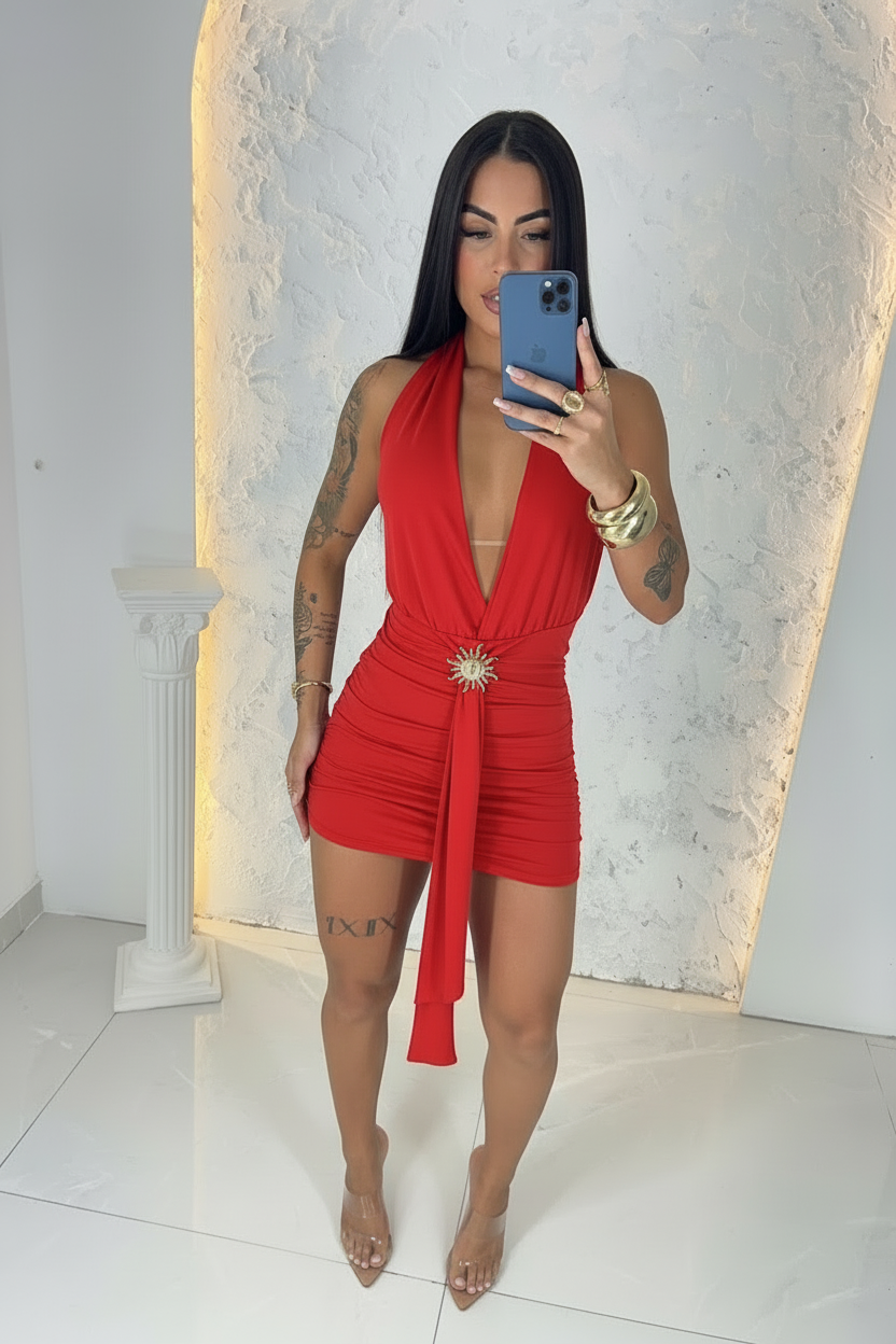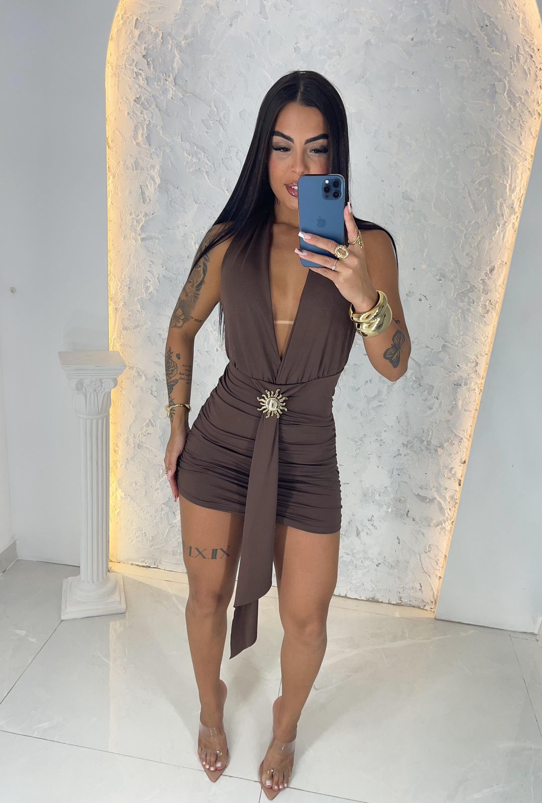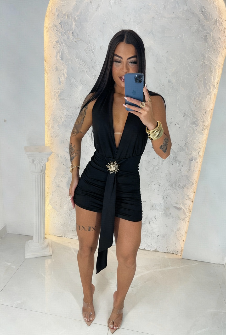Desfrute de elegância e exclusividade com nosso Vestido Solari Curto. Com seu design drapeado e costas nuas, este vestido frente...